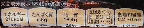 エネルギー:218kcal、たんぱく質:6.8g、脂質:16.4g、炭水化物:13.1g(糖質:5.6~10.5g、食物繊維:2.6~7.5g)、食塩相当量:0.2~0.5g