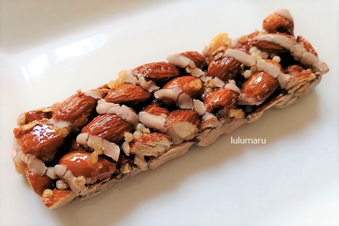 加工がほとんどされてなくてアーモンドそのものを甘さを利用してくっつけて食べやすくしている、という感じなので、カラダに良い感じ。