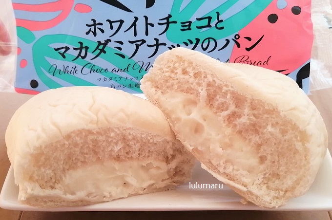 安めのチョコクリームが入ったパンであんまりチョコの味がしないのありますよね、そんな感じのチョコクリームパンに(色は白いけど)、マカダミアナッツが入ってるという感じかなと思います。