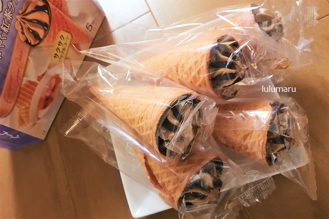 スーパーで割引されていた【ヨーロピアンシュガーコーン 華やぐ紅茶ラテ 5個入り】がラスト1個の状態だったので、冷凍庫パンパンだったけど、つい購入してきてしまいました。笑