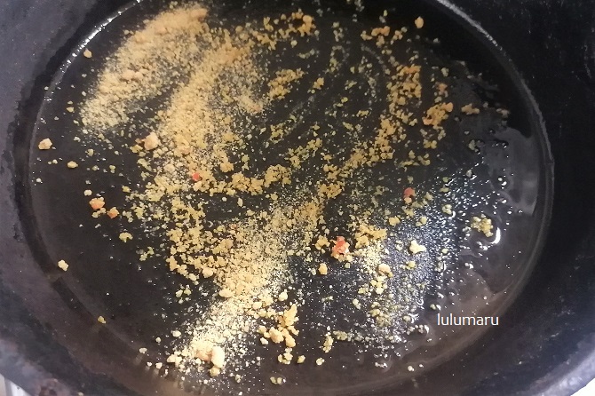 ペペロンチーノとか、ガーリックオイルをつくるような感じでじわーっと焦がさないように、油に風味を浸出させるように。