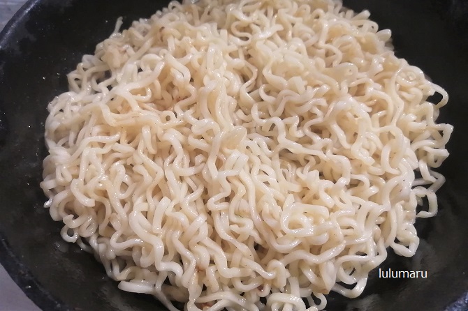 お水を大さじ1~3ほど加えて、フタをして1分ほど麺を蒸し焼きにします。