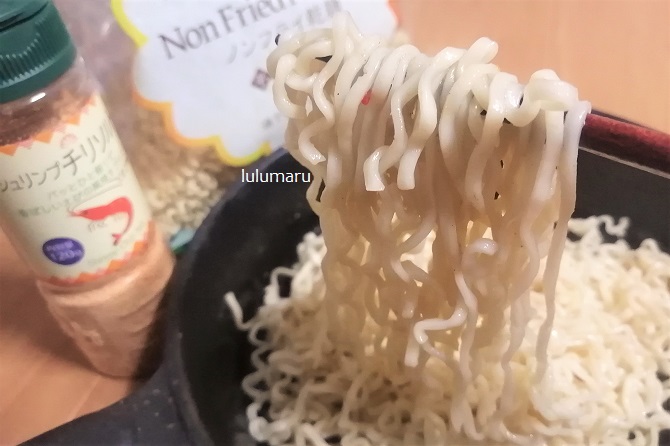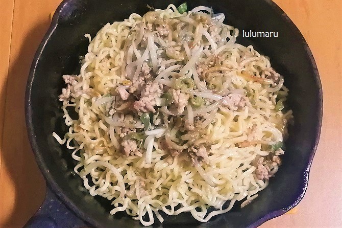 まあ、今回【ノンフライ乾麺】で焼きそばにしましたが、ふつうの焼きそば麺やパスタ、うどん、ごはんなどでも同じ感じで作れると思います(焼きそば麺は油がついてるので、入れる油は控えめに)。