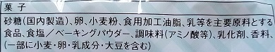 | 塩バニラ | 砂糖、卵、小麦粉、食用加工油脂、乳等を主要原料とする食品、食塩/ ベーキングパウダー、調味料(アミノ酸等)、乳化剤、香料 |