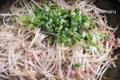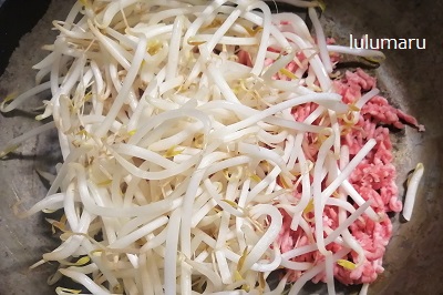 豚挽き肉をフライパンにのせ、上にもやしをのせてフタをして弱火で2~3分ほど蒸し焼きにします(炒め物じゃないね)。
