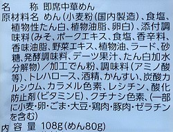 エネルギー:466kcal(めん:316kcal、スープ:150kcal)、たんぱく質:17.7g、脂質:15.0g、炭水化物:65.0g、食塩相当量:6.8g(めん・かやく:1.8g、スープ:5.0g)、カルシウム:168mg