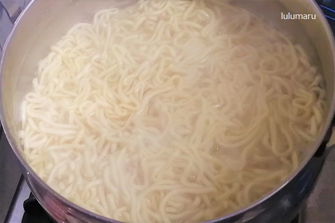 ③麺を500mlのお湯で約4分ゆでる。