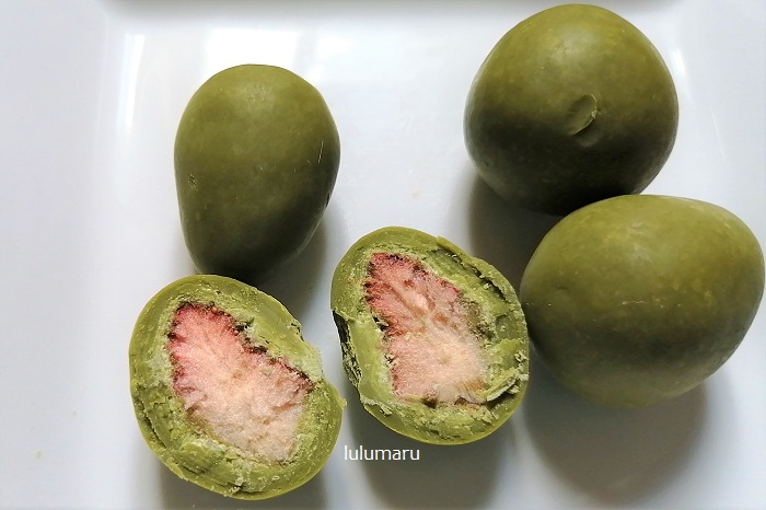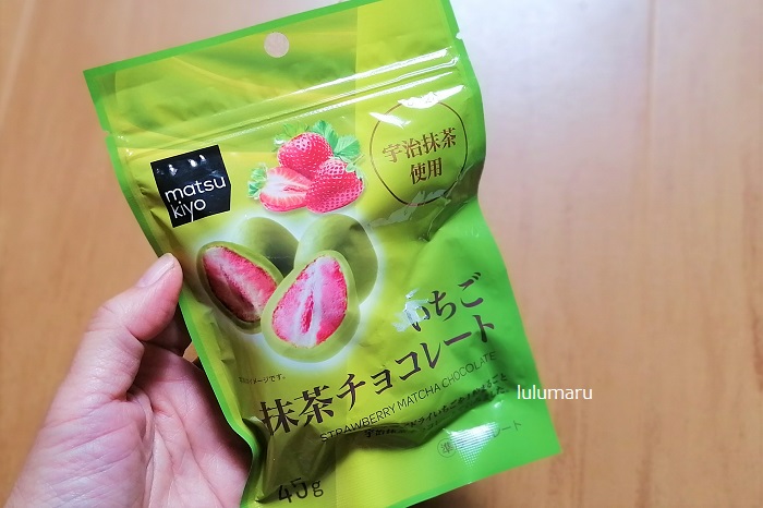 フリーズドライいちごを1粒まるごと宇治抹茶チョコレートで包みました。 マツキヨ