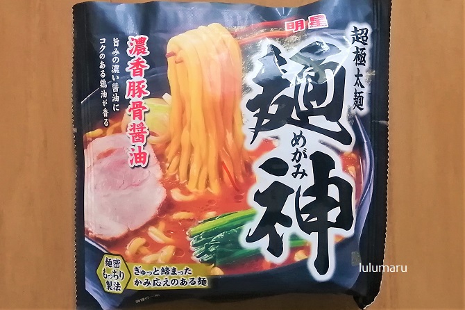 今回は、明星のインスタントラーメン【麺神 めがみ 濃厚豚骨醤油】をつくって、食べた感想・口コミレビューを、私・るるまる(40代女性)がしたいと思います。
