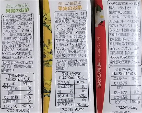確認したところ、【アップル&カモミール】と【カラマンシー&ミモザ】は原材料と栄養成分表示が同じでしたが、【いちご&ジャスミン】は少し変わっていましたので、その点、ご了承くださいませ。
