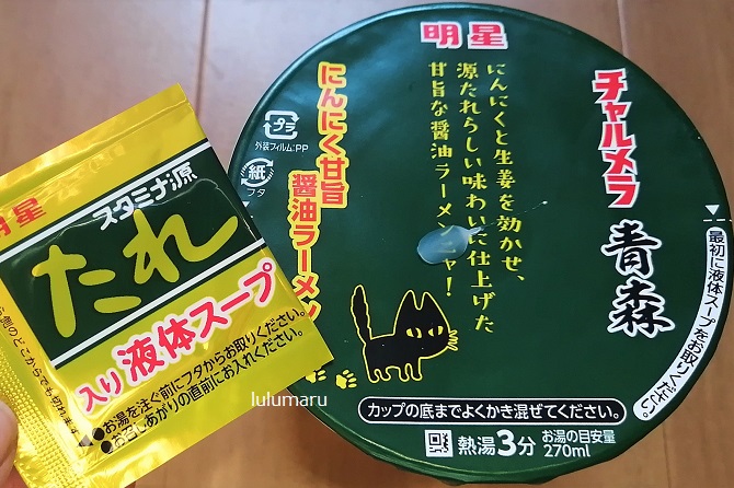 今回は 明星のインスタントカップ麺【チャルメラカップ 青森スタミナ源たれ にんにく甘旨醤油ラーメン】を食べた感想・口コミレビューを、私・るるまる(40代女性)がしたいと思います。