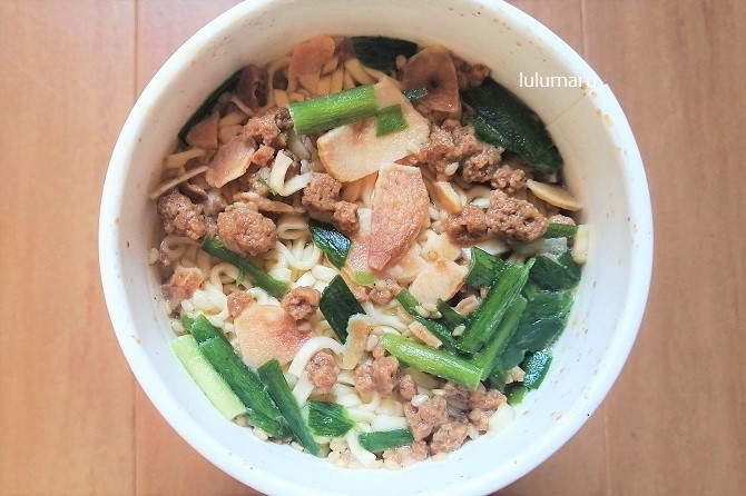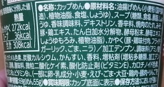 エネルギー:308kcal、たんぱく質:8.0g、脂質:12.3g、炭水化物:41.3g、食塩相当量:5.0g(めん・かやく:2.0g、スープ:3.0g)、