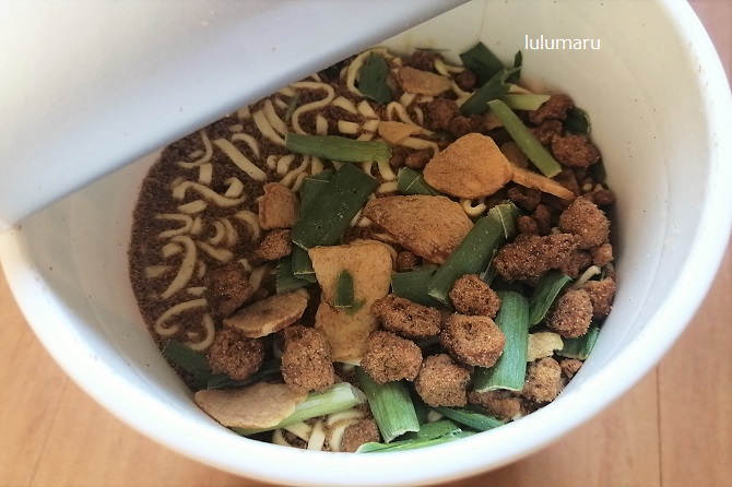 かやくには、豚・鶏味付肉、フライドガーリック、ごま、ニラが入っています。