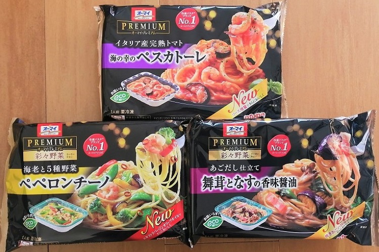 冷凍パスタブランドNO.1 nippn オーマイPREMIUMの、「海老と5種野菜 ペペロンチーノ」、「あごだし仕立て 舞茸となすの香味醬油」、「イタリア産完熟トマト 海の幸のペスカトーレ」の3種類を比較してみましたので、その口コミレビューをしたいと思います。