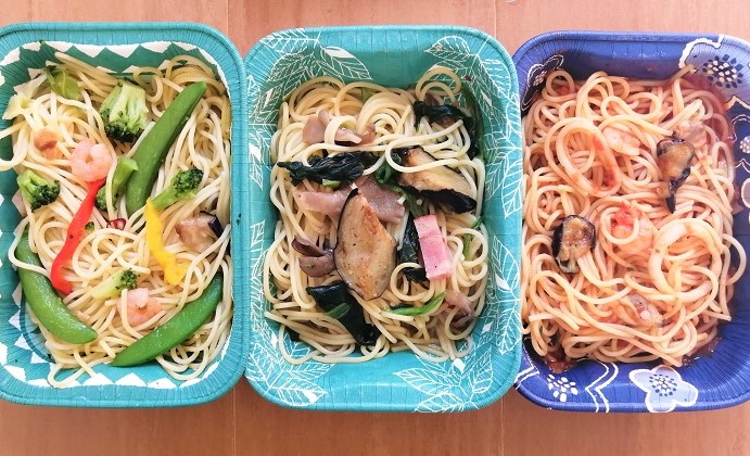 ペペロンチーノが色が白いのはわかるけど、舞茸となすの香味醤油もほとんど色は白っぽく、ペスカトーレも色がうすいです。