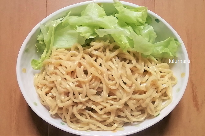 (あたたかいまま麺を盛り付けるので、レタスじゃないほうが良かったかも…)