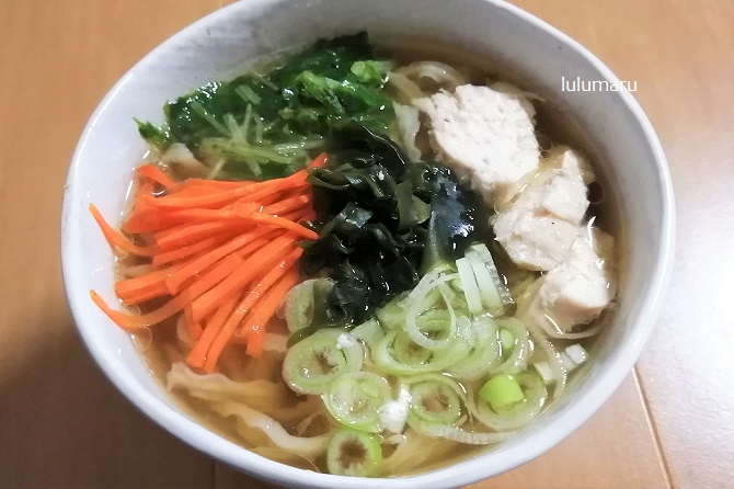 今回の具材は「鶏ハム、水菜、ねぎ、わかめ、にんじん」乗せるだけで超ラクチン♪
