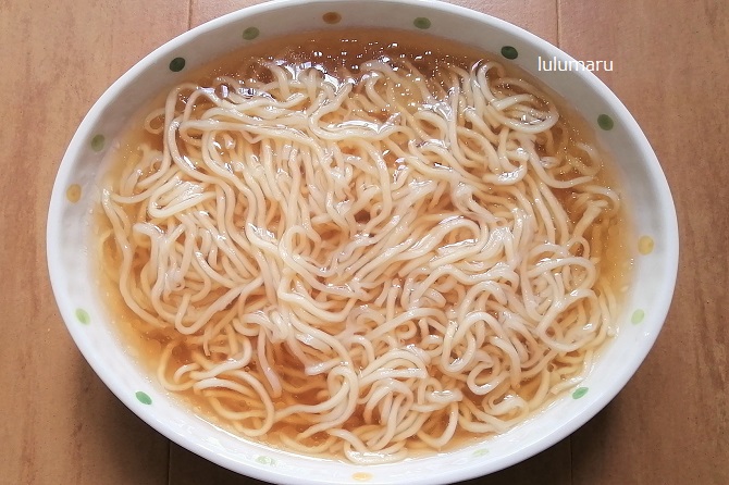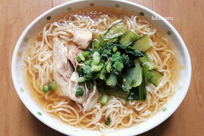 わたしは麺をゆでてから、ぬめりを取るくらいでそれほど冷やさず、「ゆでて冷凍してた小松菜」と「切って冷凍してた小口ねぎ」を解凍せずそのまま入れました。