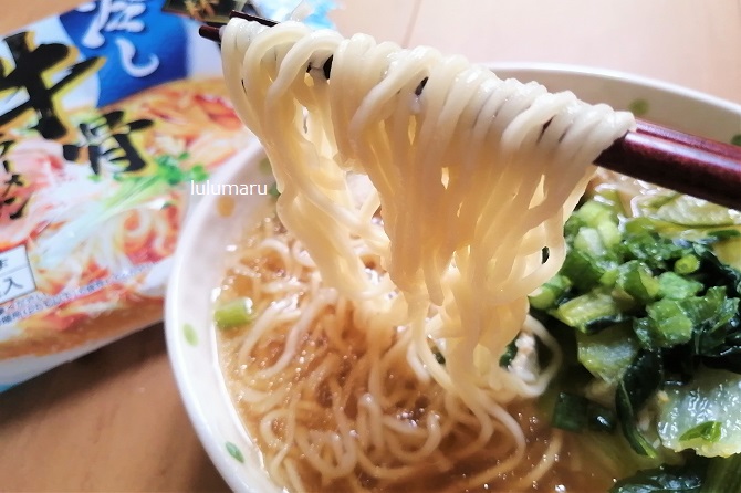 前に食べた【青竹打ち風ちぢれ麺 佐野ラーメン】の麺を細くしたような感じ。あの麺は佐野ラーメンというよりも新吉の特徴のある麺だったということなのかなと思いました。