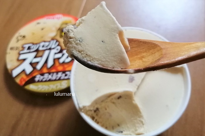 キャラメル感が少ないかなと思いますが、チョコチップがそこそこ入っているので、食感がよく、ちょっとビターな風味とアイスが合っていたので、満足感はありました。