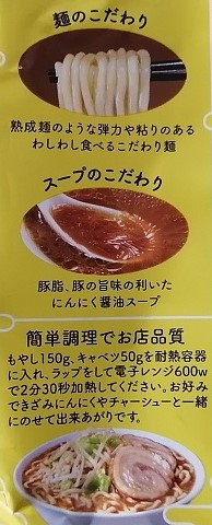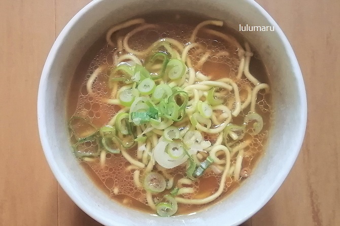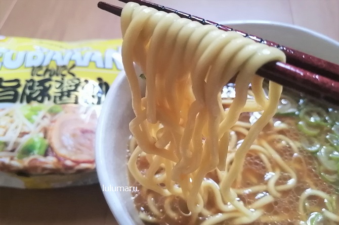 私は勝手に「豚骨ラーメン」だと思って購入したんだけど、実際は「濃いめの醤油ラーメンに豚脂たっぷりのスープ」でした。