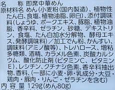 エネルギー:466kcal(めん:316kcal、スープ:150kcal)、たんぱく質:17.7g、脂質:15.0g、炭水化物:65.0g、食塩相当量:6.8g(めん・かやく:1.8g、スープ:5.0g)、カルシウム:168mg